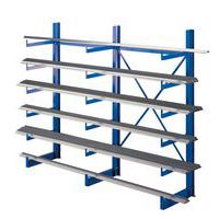 Ein- und doppelseitiges Kragarmregal für die horizontale Lagerung. Fester Halt zur Vermeidung des Herunterfallens von Objekten. Erweiterbar durch eines oder mehrere der Anbauelemente. Kragarmregal mit Schnellmontage durch geschweißte Halterung. Ständerrahmen mit 5 oder 10 fest montierten Armen mit Anschlag. Abstand zwischen 2 Ständern: 1200 mm. Abstand zwischen 2 Armen: 1225 mm.