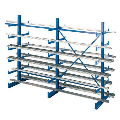 Ein- und doppelseitiges Kragarmregal für die horizontale Lagerung. Fester Halt zur Vermeidung des Herunterfallens von Objekten. Erweiterbar durch eines oder mehrere der Anbauelemente. Kragarmregal mit Schnellmontage durch geschweißte Halterung. Ständerrahmen mit 5 oder 10 fest montierten Armen mit Anschlag. Abstand zwischen 2 Ständern: 1200 mm. Abstand zwischen 2 Armen: 1225 mm.