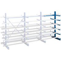 Ein- und doppelseitiges Kragarmregal für die horizontale Lagerung. Fester Halt zur Vermeidung des Herunterfallens von Objekten. Erweiterbar durch eines oder mehrere der Anbauelemente. Kragarmregal mit Schnellmontage durch geschweißte Halterung. Ständerrahmen mit 5 oder 10 fest montierten Armen mit Anschlag. Abstand zwischen 2 Ständern: 1200 mm. Abstand zwischen 2 Armen: 1225 mm.