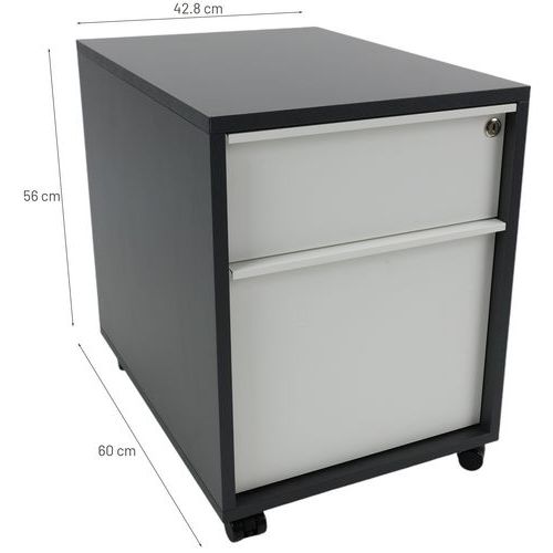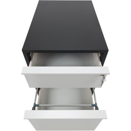 Rollcontainer Misao, melaminbeschichtet, 1-mm-Kanten, 2 Schubladen aus melaminbeschichteter Platte, davon ein Hängeordnerauszug Die Nutzhöhen der Schubladen betragen 14,5 cm und 27,7 cm, und die Nutzbreite liegt bei 32,5 cm Hängeordnerauszug für A4 und Foolscap Zentralverriegelung ohne Kippsicherung