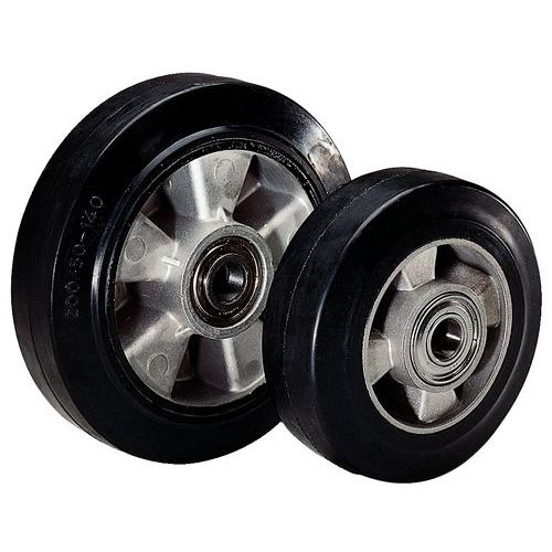 Leichte Rolle aus Aluminiumdruckguss. Leises und reibungsloses Rollen durch Lauffläche aus elastischem Gummi. Vulkanisierte Lauffläche, nicht ablösbar.