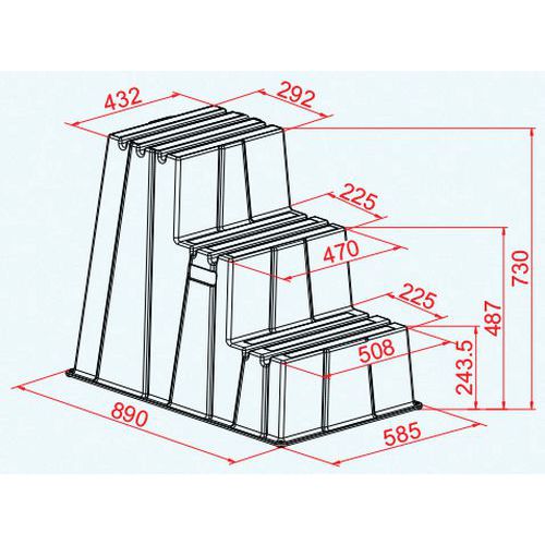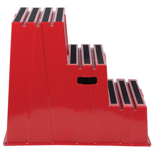 Einfacher und komfortabler Tritthocker. Breite rutschfeste Stufen. Gesicherte Schleifbänder. Müheloses Anheben mit den Griffen. Einteilig, hohe Stabilität. Tappetino in gomma antiscivolo posizionato sotto ogni angolo del gradino. Max. Belastung (kg) : 230 kg Kundengarantie : 10 Jahre