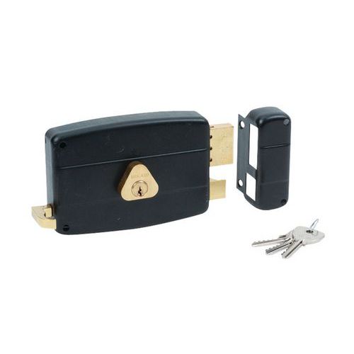 Scatola e riscontro in acciaio verniciato (tono nero). Catenaccio in acciaio. 3 chiavi in ottone nichelato. 23.000 variazioni possibili per profilo chiave. Cilindro in ottone.