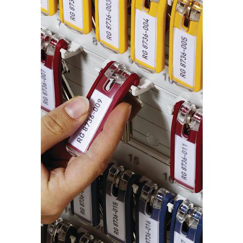 Einzigartiges Design für permanente Sichtbarkeit des Etiketts. Vereinfachtes visuelles Ordnen, da der Schlüssel immer flach auf der Rückseite liegt. Praktisches Öffnen des Schlüsselanhängers durch einfaches Drücken. Einfaches Aufhängen an den Leisten der Key box-Schlüsselbretter und -Schlüsselschränke. Kundengarantie : 3 Jahre