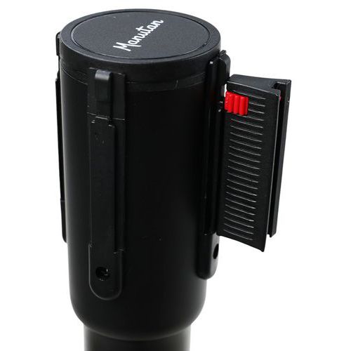 Pfosten mit ausziehbarem Gurtband und 3 Befestigungspunkten. Bandeinzug mit automatischer Abbremsung für sanftes Einziehen beim Aushängen des Gurtbands. Sockel mit Gummischutz für mehr Stabilität.