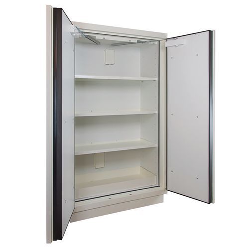 Sicherheitsschrank, Verriegelung mit Schlüssel. Griff über die gesamte Höhe des Schranks, für ergonomischere Handhabung und leichteres Öffnen. Lüftungsöffnungen für den Anschluss an eine Belüftung. Fachböden im Raster von 6,4 cm verstellbar. Entspricht den Normen EN14470-1 und FM 6050. Guarnizioni porta termodilatanti. Punto di collegamento a terra. Resistenza al fuoco di 90 minuti e testato fino a 105 minuti.