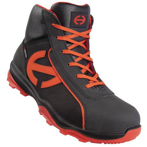 Hohe Sicherheits-Sneakers Run-R 300 High S3. PU2D-Sohle, griffig, öl- und kohlenwasserstoffbeständig, selbstreinigendes Profil, stoßdämpfend. Schaft aus wasserabweisendem, geöltem Nubukleder. 3D-Polyester-Mesh-Futter, atmungsaktiv, feuchtigkeitsabsorbierend und schnell trocknend. Metallfreie Zehenkappe, leichter als Stahl, leitet Wärme und Kälte nicht Nichtmetallische, durchtrittsichere Sohle, leicht, flexibel, wärme- und kältebeständig. Herausnehmbare, anatomische Innensohle mit Stoßdämpfern vorne und hinten. Hergestellt in Italien Amagnétique Antistatisch CE