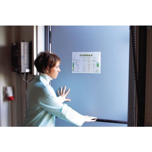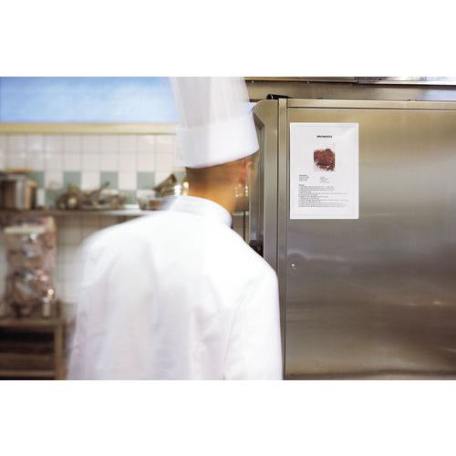 Utilizzo in verticale e in orizzontale. Soluzione espositiva per l'utilizzo su macchine, porte, tavole metalliche, frigoriferi, ecc. Tasca in PVC con retro magnetico. Può contenere fino a 10 fogli di carta da 80 g. Fondo completamente green.