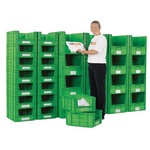 Breite Öffnung für einen einfachen Zugriff auf den Inhalt. Große Beständigkeit durch Verstärkungsrippen. Hohestabiles Stapeln. Einfache Identifizierung durch Etikettenhalter. Mit glatten Wänden: garantiert einfache Reinigung. Max. Belastung (kg) : 200