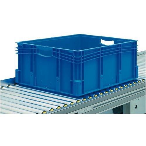 Sehr gut stapelbarer Behälter mit verstärkten Ecken.