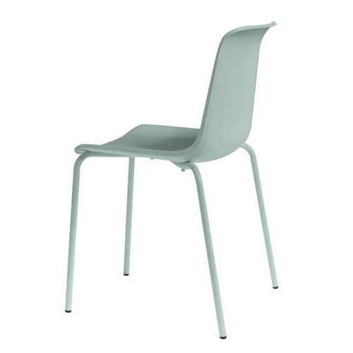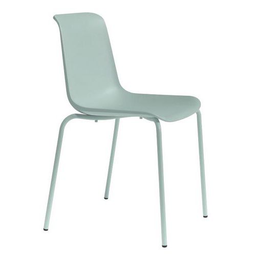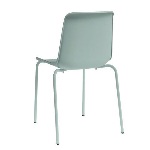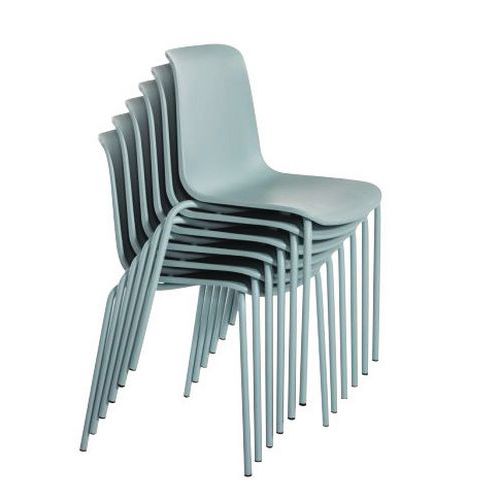 Stapelbarer Stuhl mit 4 schlichten, geraden Füßen. Lehne mit Epoxidbeschichtung.