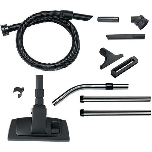Im Lieferumfang vom Zubehörset im Durchmesser von 32 mm enthalten: 1 Rohr (2,5 m), 1 Krümmer mit Saugkraftregelung, 1 Schlauch (2,2 m), 2 Edelstahlrohre, 1 umschaltbare Kombidüse für glatte Böden und Teppich, 1 Polsterdüse (ersetzt Möbeldüse), 1 flache Fugendüse (ersetzt Sockelaufsatz).