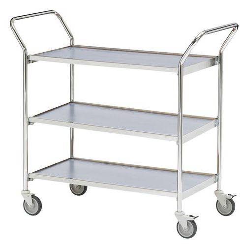 Tischwagen in Chromausführung, 3 Platten 1000 x 420 mm und 2 Lenkgriffe. Robuste Platte mit 25 x 20 mm Rand und 12 mm Dicke. Ausgestattet mit 4 Lenkrollen Ø 100 mm, 2 davon mit Bremse, graue Gummibereifung.
