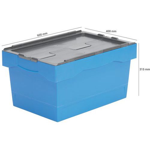 Einfache Identifizierung im logistischen Fluss durch verschiedene Deckelfarben. Vielseitig für manuelle und automatische Handhabung. Sicherung des Inhalts durch verplombbaren und versiegelbaren Deckel. Stapelbar und leer aufeinandersetzbar zur Platzeinsparung. Max. Belastung (kg) : 25 kg