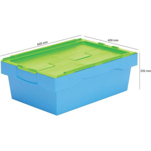Einfache Identifizierung im logistischen Fluss durch verschiedene Deckelfarben. Vielseitig für manuelle und automatische Handhabung. Sicherung des Inhalts durch verplombbaren und versiegelbaren Deckel. Stapelbar und leer aufeinandersetzbar zur Platzeinsparung. Max. Belastung (kg) : 25 kg