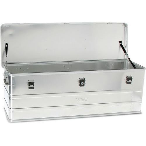 Stabile Transportkiste aus Aluminium, Stärke 10/10. Hohe Widerstandskraft mit Eckaufsätzen: Sicheres Aufeinanderstapeln der Kisten. Der Deckel wird in geöffnetem Zustand von 2 Bändern gehalten und kann weit geöffnet werden. Sperrriegel aus Edelstahl, Lasche aus Kunststoff. Bequemes Tragen: Rutschsichere und einklappbare Griffe. Beständigkeit gegen Verformung, Korrosion und Witterungseinflüsse.