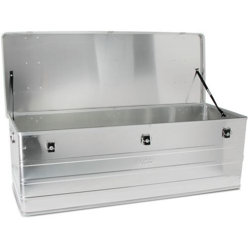 Stabile Transportkiste aus Aluminium, Stärke 10/10. Hohe Widerstandskraft mit Eckaufsätzen: Sicheres Aufeinanderstapeln der Kisten. Der Deckel wird in geöffnetem Zustand von 2 Bändern gehalten und kann weit geöffnet werden. Sperrriegel aus Edelstahl, Lasche aus Kunststoff. Bequemes Tragen: Rutschsichere und einklappbare Griffe. Beständigkeit gegen Verformung, Korrosion und Witterungseinflüsse.