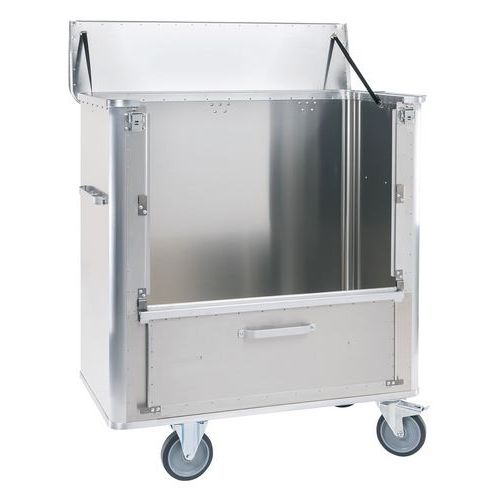 Universal einsetzbarer Transportwagen aus Aluminium. Hygienisch, geruchsneutral und korrosionsbeständig. Leichtes Handling und Ergonomie selbst bei max. Beladung. Glatte Oberfläche, Wände ohne Sicken und daher leicht zu reinigen. Abklappbare Wand wird durch zwei Magnete in geöffneter Position fixiert. Scharnierdeckel, 2 Haltegurte und 2 Hebelverschlüsse. Fondo inclinato con 2 fori di scarico, i due fori di scarico dotati di valvola di scarico, tappo e catenella. Fondo sigillato con silicone. Maniglie anodizzate su entrambe le pareti frontali.