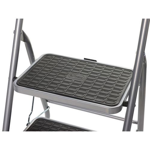 Bequeme Trittleiter mit extrabreiten Stufen. Rutschfest. Sicherheitsbügel. Bleibt durch Sicherheitshaken geöffnet. Sicherung durch hohes Geländer. Kundengarantie : 5 Jahre Max. Belastung (kg) : 150