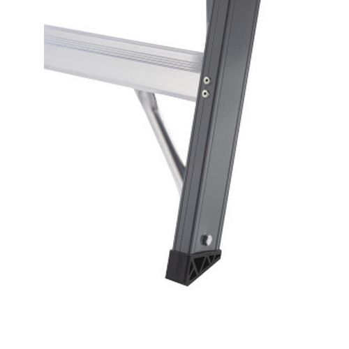 Beidseitig begehbare Trittleiter mit Geländer und Werkzeugbehälter. Plattform mit selbstverriegelbaren Scharnieren mit Einklemmschutz. Spreizsicherung durch Querstrebe verhindert Zusammenklappen. Extrahohe abgerundete Stufen für bequemes Auftreten. Ultrastabil durch große rutschhemmende Füße. Trittleiter mit schmutzabweisender grauer Beschichtung.