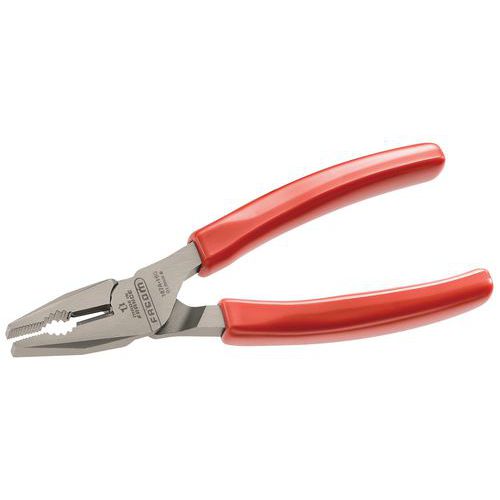 Universalzange, poliert und lackiert, mit PVC-überzogenem Griff für besseres Greifen und Handhaben.