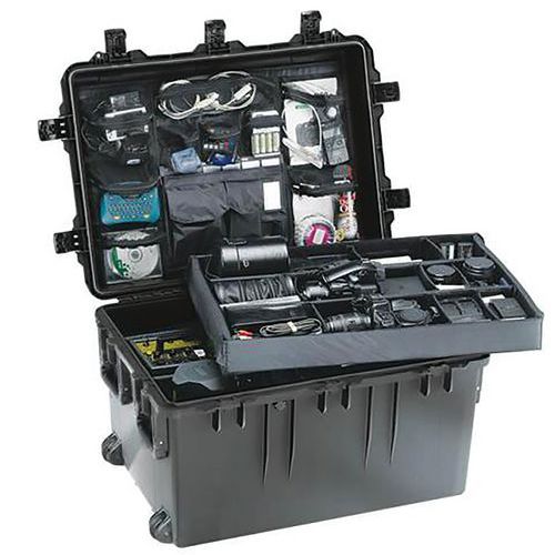 Breiter wasser-/staubdichter und stoßbeständiger Schutzkoffer Peli Air Case 3075 in Schwarz.