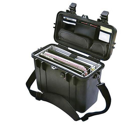 Wasser- und staubdichter Schutzkoffer Peli Case 1430 in Schwarz, mit Stauraum im Deckel.