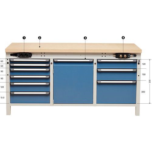| Höhe Schublade | 2 x 60, 2 x 90, 2 x 120, 2 x 150, 1 x 300 mm |