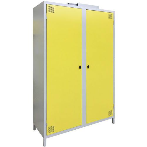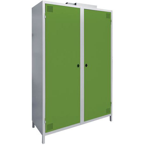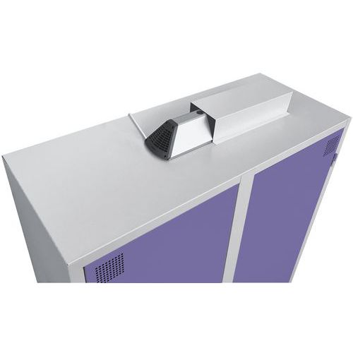Schrank zur schnellen Desinfektion von Kleidung und Werkzeugen, effizient und günstig, mit Ozon-Technologie. Für ungehinderten Ozon-Strom und gute Lüftung ist der Fachboden großzügig durchlöchert. Schrank mit Schutzhaube und Betriebsanzeige Air Care. Prodotto progettato e fabbricato in Francia. Soluzione all'ozono: disinfezione totale di indumenti e strumenti in tempi record!