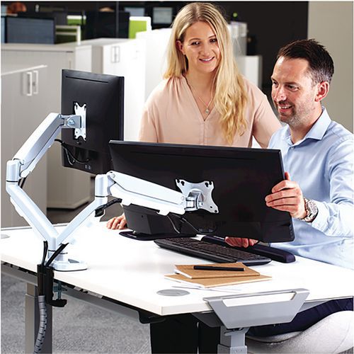 Auf Knopfdruck einstellbarer, zweifacher Monitorarm.