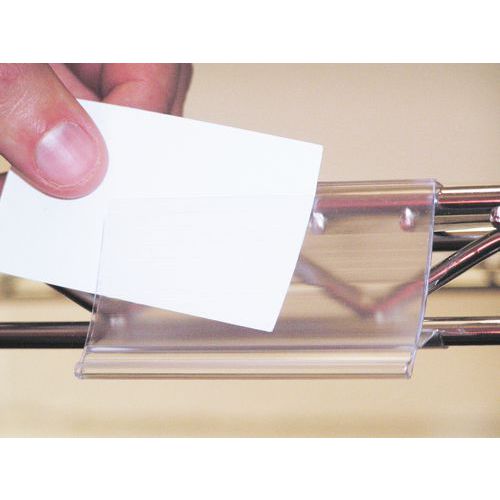 | Produktname | Etikettenhalter für Rollcontainer, Modell: Mit Clip, Gesamtbreite: 75 mm, Gesamthöhe: 43 mm, Materialien: PVC |