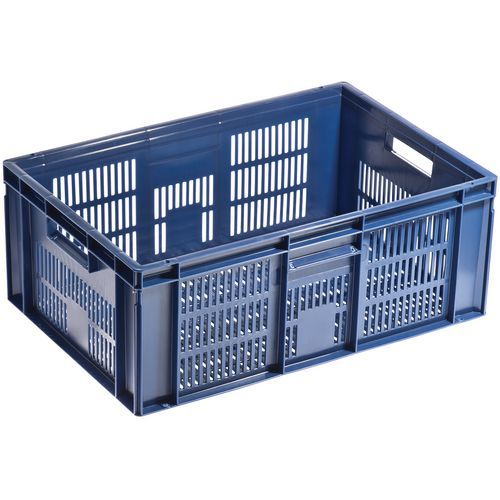 Blauer Euronormbehälter, hohe Stabilität beim Stapeln Garantiert gute Belüftung dank durchbrochener Wände Einfache Handhabung dank großen Grifföffnungen Beständig gegen Öle, Fette und zahlreiche Chemikalien