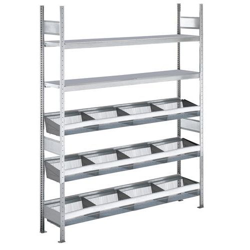 Sehr vielseitiges Industrieregal aus Stahl. 3 Ebenen mit Körben + 2 Ebenen mit Fachböden (Spanplatte oder Blech). Doppelt perforierte Ständerrahmen zur beidseitigen Verwendung. Hochstabile Konstruktion: kein Kreuzverband erforderlich. Kombination mit anderen Regalen der Reihe Easy-Fix Plus. Gitterkorb mit 5 Trennwänden. Maschenbreite: 1 mm