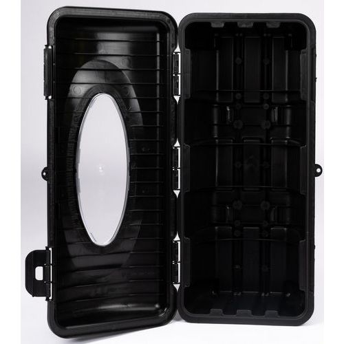 Progettato per essere montato su veicoli. Per estintore da 6 kg. Caricamento frontale. Apertura con nottolini in plastica. Approvato TUV RHEINLAND per impermeabilità e resistenza alle vibrazioni. Resistente agli shock meccanici e termici (-40°C/+80°C). Installazione della porta reversibile. Cinghia di supporto fornita.