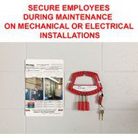 Kann bis zu 12 Sicherheitsvorhängeschlösser verwahren und enthält Aufkleber in Englisch, Spanisch und Französisch.