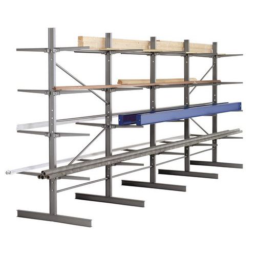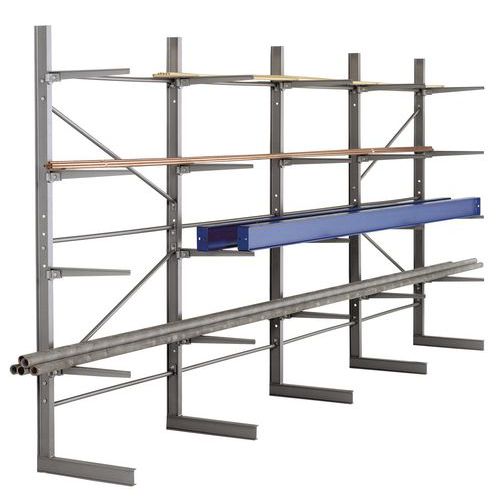 Ein- und doppelseitiges Kragarmregal für die Lagerung von langen Teilen. Arm ohne Anschlag für das einfache Entnehmen der gelagerten Waren. Einfach aufzubauen und unbegrenzt zu erweitern mit einem oder mehreren Anbauelementen.