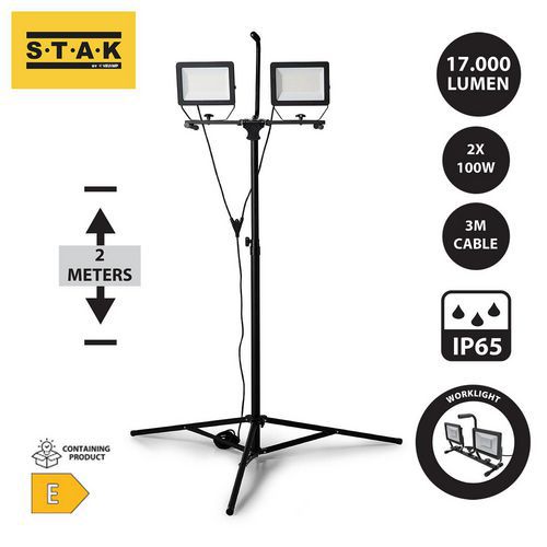 | Produktname | LED-Scheinwerfer auf Stativ, 2 x 100 W, Minos - Velamp, Lichtstrom: 17000 lm, Energie: 200 W |
