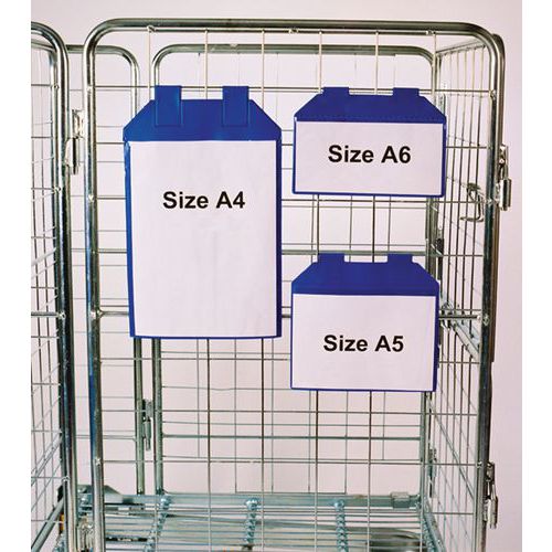 Magnetische Sichttafeln für Rollcontainer, Befestigung mit 2 Clips. Etikettenträger mit Schutzklappe, ideal für den Einsatz im Außenbereich. Geeignet für einen Temperaturbereich von -30°C bis +50°C. In 3 Formaten erhältlich: A4 - A5 - A6