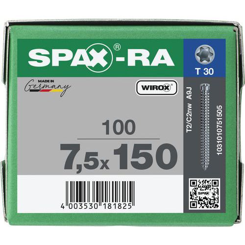| Produktname | Packung mit 100 Rahmenankern mit T-Star-Plus-Antrieb, Wirox, TX Ø 7,5 mm – Spax, Werkstoff: Stahl |