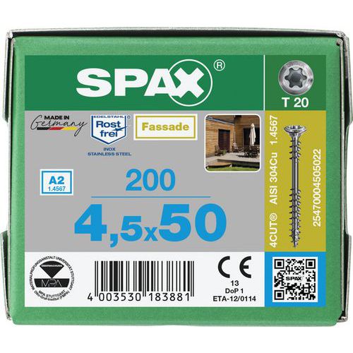 Packung mit Linsenkopf-Fassadenschrauben zur Fixierung TX Ø 4,5 mm – Spax, Werkstoff: Stahl