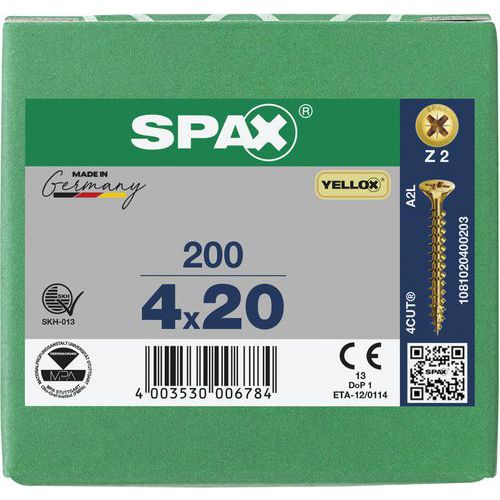 Packung mit Senkkopf-Universalschrauben Yellox PZ Ø 3 bis 5 mm – Spax, Werkstoff: Stahl, Gewinde Ø: 4 mm Packung mit Senkkopf-Universalschrauben Yellox PZ Ø 3 bis 5 mm – Spax, Werkstoff: Stahl, Gewinde Ø: 4 mm