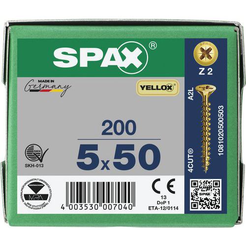 Packung mit Senkkopf-Universalschrauben Yellox PZ Ø 3 bis 5 mm – Spax, Werkstoff: Stahl, Gewinde Ø: 5 mm Packung mit Senkkopf-Universalschrauben Yellox PZ Ø 3 bis 5 mm – Spax, Werkstoff: Stahl, Gewinde Ø: 5 mm
