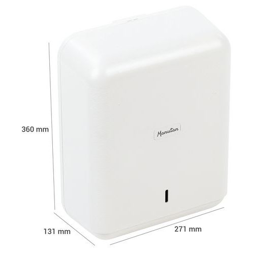 | Produktname | Papiertuchspender - 100% recyceltes ABS - Manutan Expert, Farbe: Weiß, Höhe: 360 mm, Breite: 271 mm |