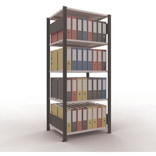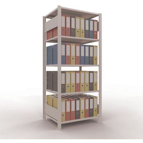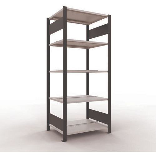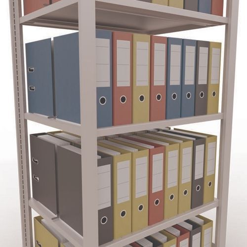 Büroregal mit schöner Oberflächenverarbeitung für leichte Lasten Fachboden mit Blech-Vollverkleidung für alle Arten von Gegenständen Zentraler Anschlag zur Begrenzung jeder Seite. Ständerrahmen Blech ohne Löcher an Vorderseite Schutzfüße zum Schutz der Böden Werkzeugfreie Montage mit Clipsystem