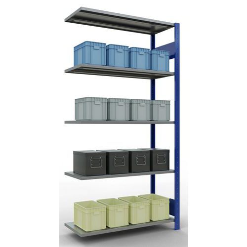 Robustes komplettes Regalsystem mit edler Epoxid-Beschichtung in grau oder blau. Auf den durchgehenden Stahlfachböden können Waren in vielen unterschiedlichen Größen gelagert werden. Einfach und schnell durch Ineinanderstecken aufzubauendes Industrieregal, kein spezielles Werkzeug erforderlich. Einfach erweiterbar mit einem oder mehreren Anbauelementen.