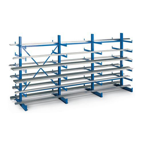 Ein- und doppelseitiges Kragarmregal für die horizontale Lagerung. Fester Halt zur Vermeidung des Herunterfallens von Objekten. Erweiterbar durch eines oder mehrere der Anbauelemente. Kragarmregal mit Schnellmontage durch geschweißte Halterung. Ständerrahmen mit 5 oder 10 fest montierten Armen mit Anschlag.