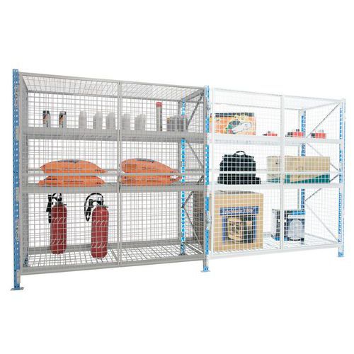 Solides und stabiles, komplett vergittertes Sicherheitsregal. Erhöhte Stabilität mit diagonalen und horizontalen Traversen (Z-Form). Hohe Sicherheit: Eingeschränkter Zugang durch verschließbare Doppeltür. Ausgestattet mit 2 oder 3 höhenverstellbaren Gitterböden (je nach Höhe). Einfach aufzubauen und zu erweitern mit einem oder mehreren Anbauelementen.