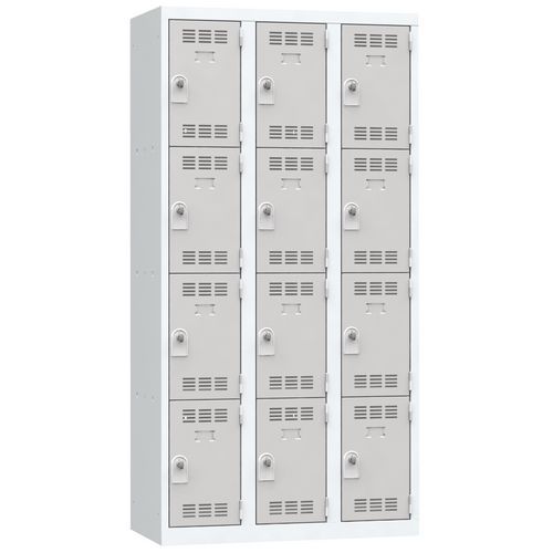Spind mit mehreren Fächern, 1 bis 4 Säulen und jeweils übereinander angeordneten Fächern Einteilig und werkseitig verschweißt für mehr Stabilität und Robustheit. Günstig und funktionell dank breiter Fächer. Zur Ablage von Geräten und Gegenständen unterschiedlichster Art. Geeignet für Schulen, Sportzentren, Krankenhäuser, Unternehmen sowie den Dienstleistungs- und Industriesektor usw.