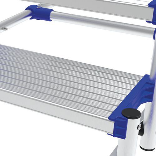 Beidseitig betretbarer, stationärer Steg aus Aluminium, niedrige Zugangshöhe. Sicher: 2 integrierte Geländer für verbesserte Absturzsicherung. Stabil mit breiter Plattform und rutschfesten, tiefen Stufen. Der Steg kann bei Bedarf mit großen Doppelbefestigungsfüßen am Boden befestigt werden. Komfortabel, skalierbar, vielseitig, an alle Anforderungen anpassbar. Sehr widerstandsfähige Struktur, geeignet für den intensiven Gebrauch, flache Böden erforderlich. Doppio piedino di fissaggio, viti Ø 8 mm (non incluse). Ringhiera con zoccolo integrato (h 100 mm).