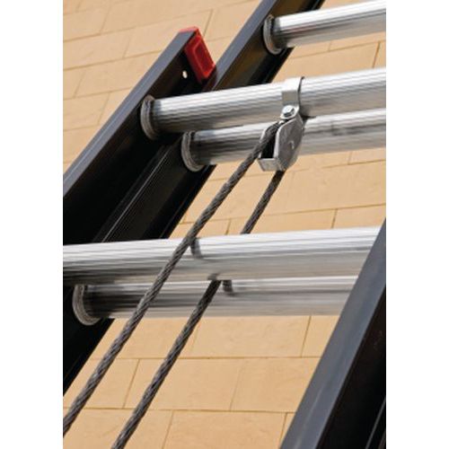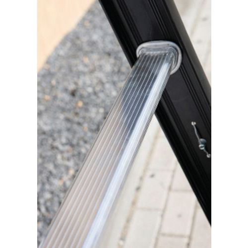 Dank selbstverriegelbaren Schwenkhaken einfach ausklappbar. Rutschfeste Leiter mit großer Auftrittfläche. Durch den Ausleger am Sockel wird jegliches Einsinken in weichem Boden verhindert. Die Spreizsicherung verhindert ein unvermitteltes Zusammenklappen. Mit 2 Rädern am oberen Teil für ein besseres Gleiten an Wänden entlang. Max. Belastung (kg) : 150